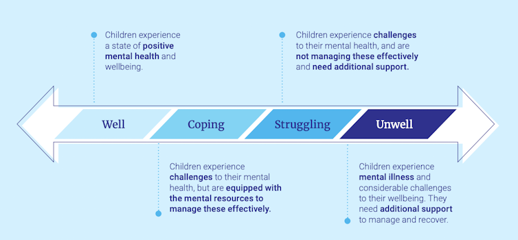 The strategy suggests viewing children’s mental health and well-being along a continuum of well–coping–struggling–unwell, and recommends focusing on support, prevention and early intervention before mental illness occurs.