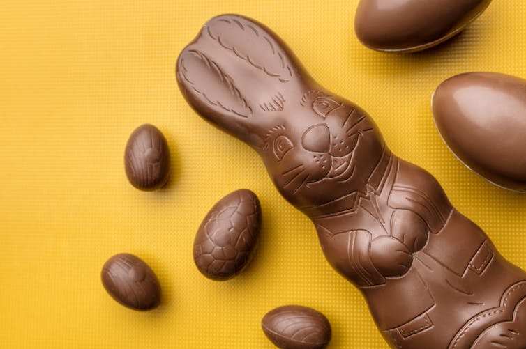 Unfortunately, the health benefits of cocoa solids are easily offset by the high sugar and fat content of modern-day chocolates. For example, milk and white chocolate eggs are on average 50% sugar, 40% fat (mostly saturated fats) – which means a lot of added kilojoules (calories).