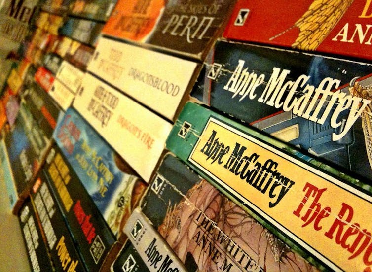A third person has her father’s “old” Anne McCaffrey’s Dragonriders of Pern series: he read it to her as a teenager, then passed it down. The book “sparked” her interest in science fiction, and she now intends to pass it on to her own teenager. Her book, too, is “battered”, with “chunks falling out when you read it”. The cover is falling off.