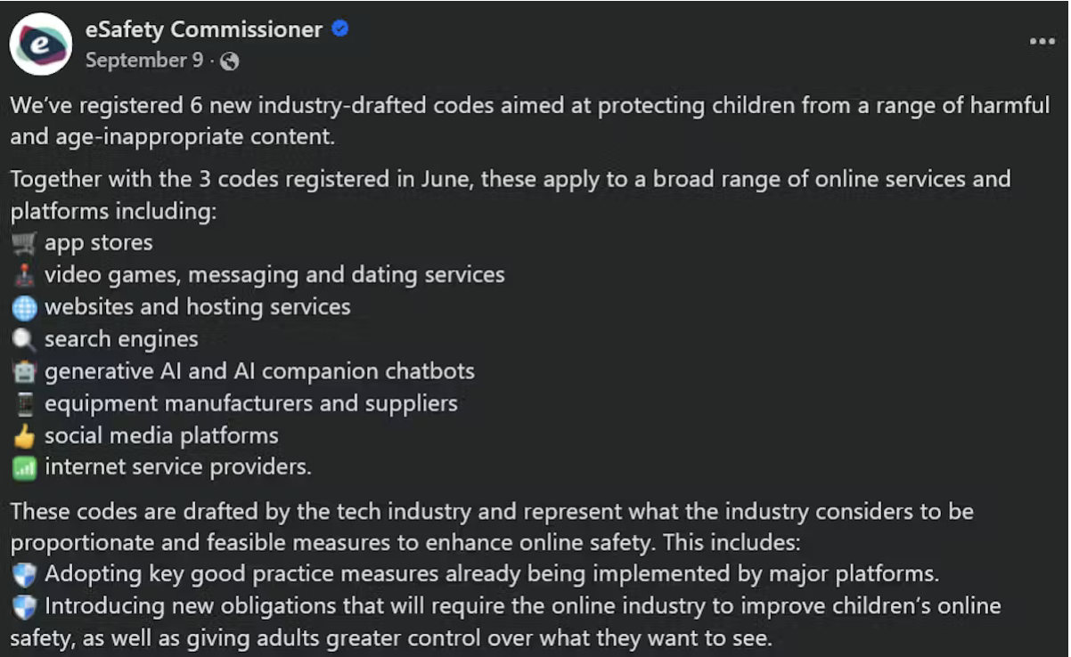 eSafety’s facebook post from September 9th alluding to what services are covered by the additional codes. Facebook