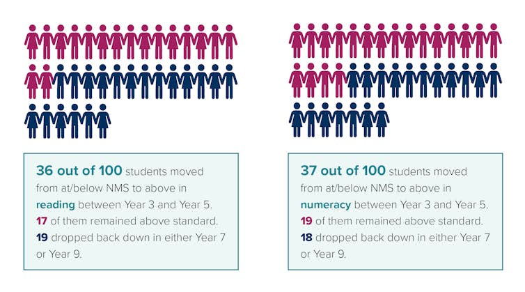 We also found less than one fifth of students (17% in reading and 19% in numeracy) went on to perform consistently at expected levels. This means fewer than one in five students were supported to catch up to their peers.