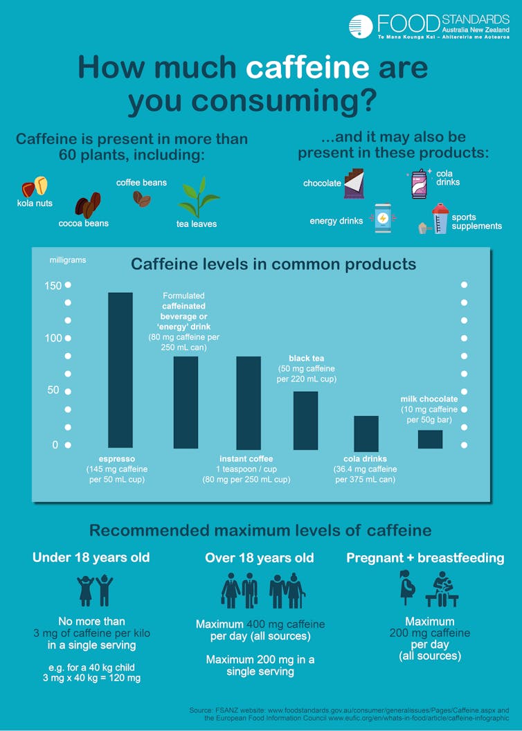As such, safe caffeine levels are determined on a weight basis: 3mg per kg of body weight per day. For example, children aged 9 to 13 years, who weigh no more than 40kg, should have no more than 120mg of caffeine per day. Those aged between 14 to 17 years who weigh less than 60kg should have no more than 180mg per day.