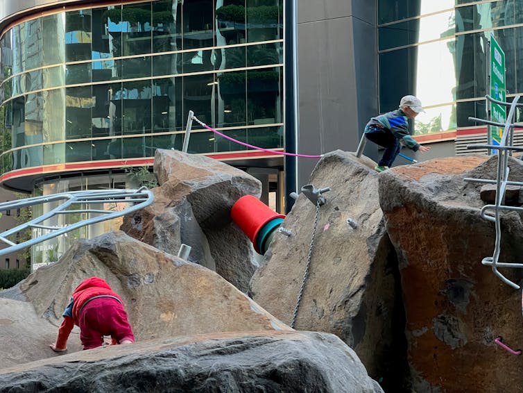 Imagine this: a heap of colourful plastic buckets stacked on top of each other to form a climbable bridge, monolithic bluestone boulders holding up a contorted slide, a pile of concrete demolition debris moonlighting as a resting spot.